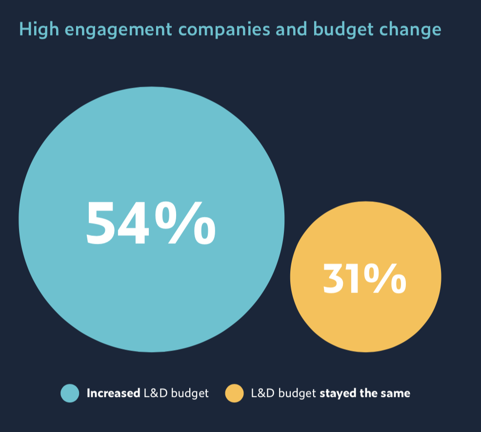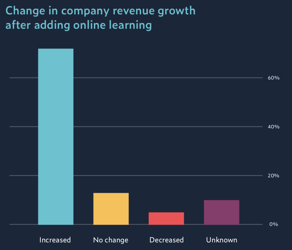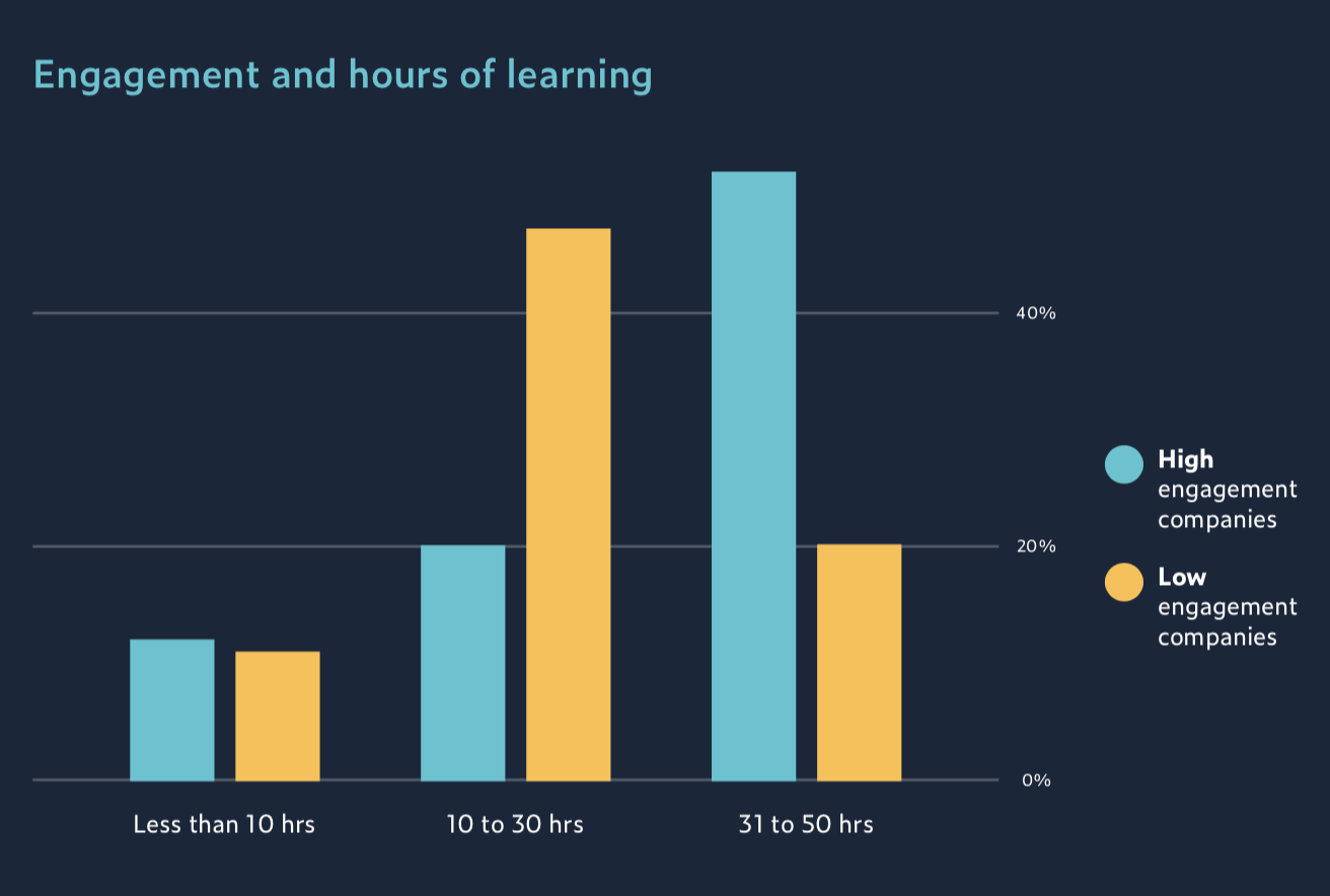 Однако, проанализировав результаты опросов, специалисты Udemy установили, что обучение практически не влияет на бизнес, если рассматривать его отдельно от прочих возможностей роста внутри компании. Чтобы мотивировать сотрудников и, как следствие, повлиять на ключевые бизнес-показатели, руководство компаний вынуждено не только инвестировать в корпоративное обучение, но и предлагать сотрудникам возможности для горизонтального и вертикального роста внутри компании.