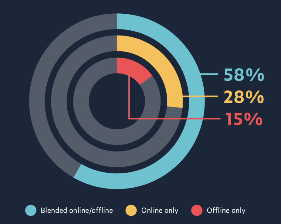 Кроме того, специалисты Udemy выяснили, что руководство компаний охотнее инвестирует в смешанное (58%) и онлайн-обучение (28%). Только 15% руководителей развивает офлайн-обучение в компании.