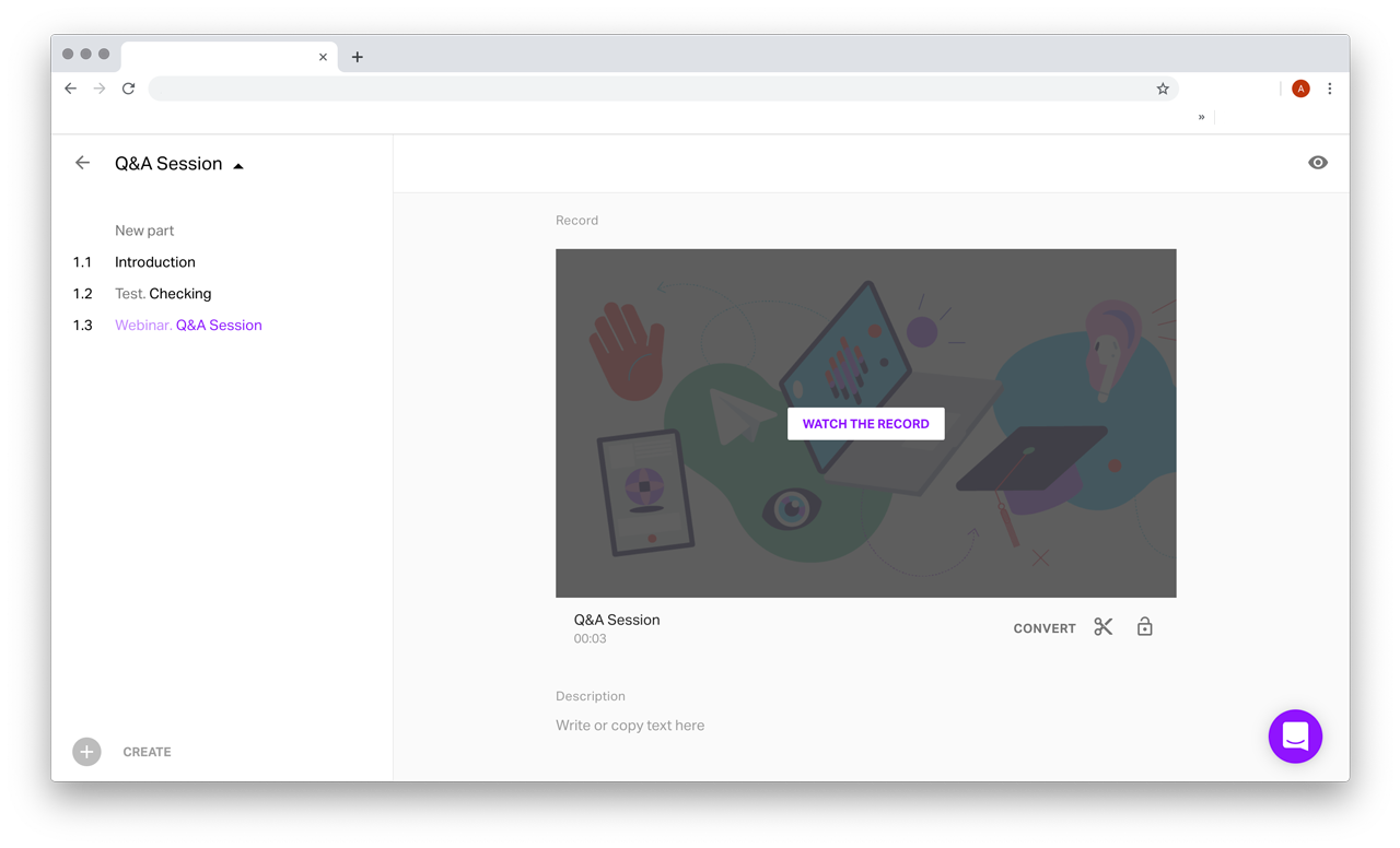 Intuitive browser-based course editor supports all file types and converts webinar records.